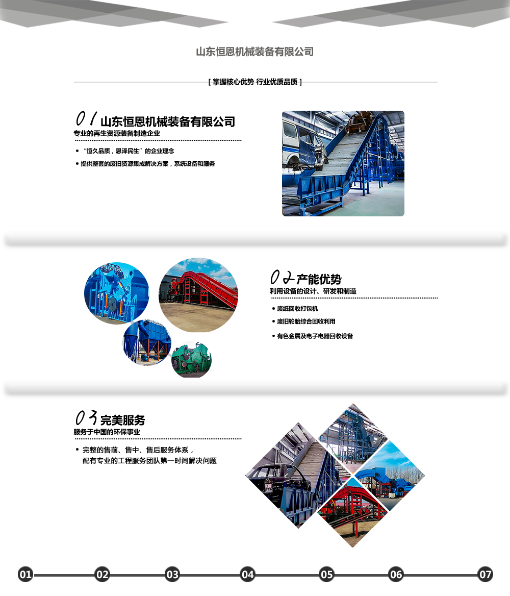 山東恒恩機(jī)械裝備有限公司是一家專(zhuān)業(yè)的再生資源裝備制造企業(yè),公司致力于廢鋼破碎生產(chǎn)設(shè)備、廢紙回收打包機(jī)、廢舊輪胎綜合回收利用、有色金屬及電子電器回收設(shè)備、汽車(chē)拆解設(shè)備等再生資源綜合回收利用設(shè)備的制造;并提供整套的廢舊資源集成解決方案,系統(tǒng)設(shè)備和服務(wù)!公司秉承“恒久品質(zhì)”的企業(yè)理念,提供設(shè)備,努力為改善自然環(huán)境作為我們畢生的事業(yè)去不懈的前行!